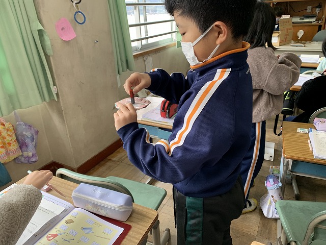音楽の授業で「あいあい」を歌っています。振り付けをしながら、楽しく歌っていました。