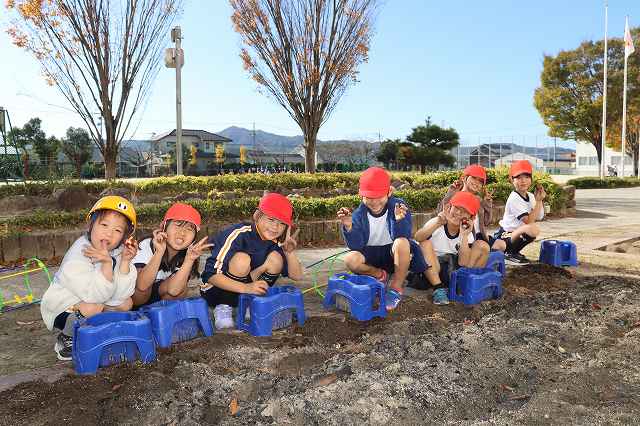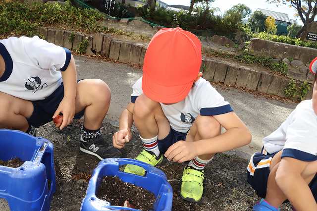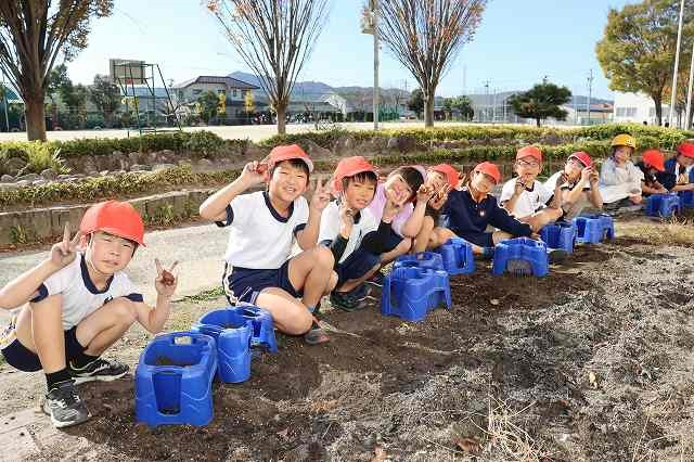 「花いっぱい 夢いっぱい事業」でチューリップをいただきました。毎年、1年生が6年生の卒業式に向けて花が咲くようにこの時期に植えます。今年もアサガオの植木鉢を利用して、植えました。