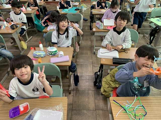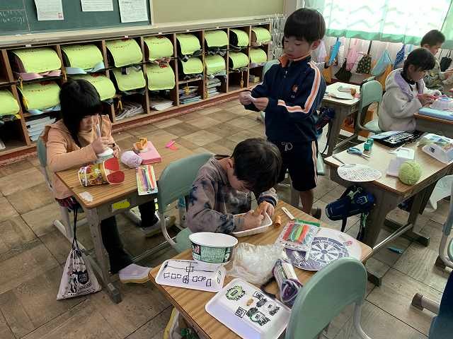 図工で1年生は、「ふわふわゴー」の工作をしています。どんなものができるのかな。カップ麺をつかっているね。お肉とかのトレーもつかっているね。でき上りまでは、ないしょ!
