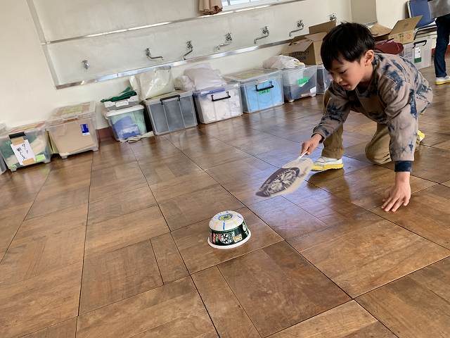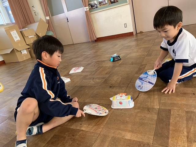 みんな、いろいろとくふうしているね。さあ、できあがったかな。みんなでやってみよう!うちわでふわふわとうごいているね。