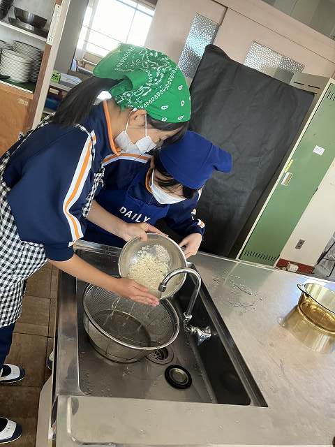 5年生は、調理実習で新米のお米を透明鍋で炊きます。できるかな。