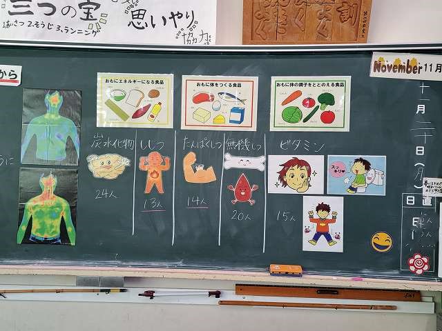 また、5年生は、栄養士の先生の「1日のスタートは朝ごはん」の授業をおこないました。今日の朝ごはんは、何を食べてきたかな。